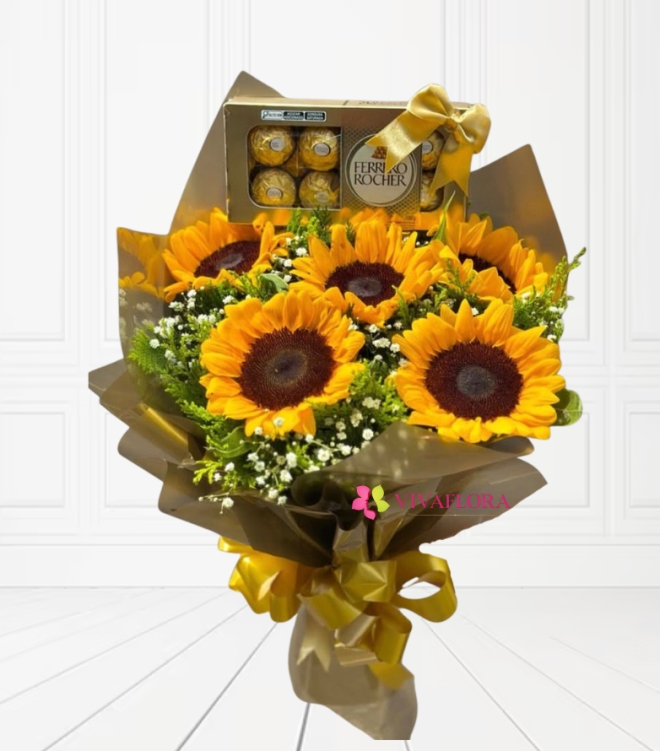 Un detalle lleno de luz y dulzura. Este hermoso bouquet de girasoles, símbolo de alegría y energía positiva, se combina con caja de chocolates ferrero x8 que hacen de este regalo una experiencia inolvidable. Perfecto para sorprender, alegrar el día o expresar cariño de una forma especial. Incluye tarjeta impresa personalizada