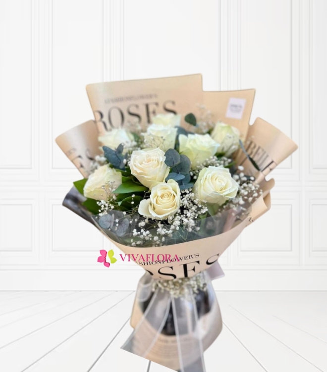 Bouquet elaborado con rosas rosadas frescas, símbolo de ternura, amor y admiración. Su combinación con follajes verdes y envoltura elegante crea un detalle delicado y sofisticado, perfecto para cualquier ocasión especial. Incluye tarjeta impresa personalizada